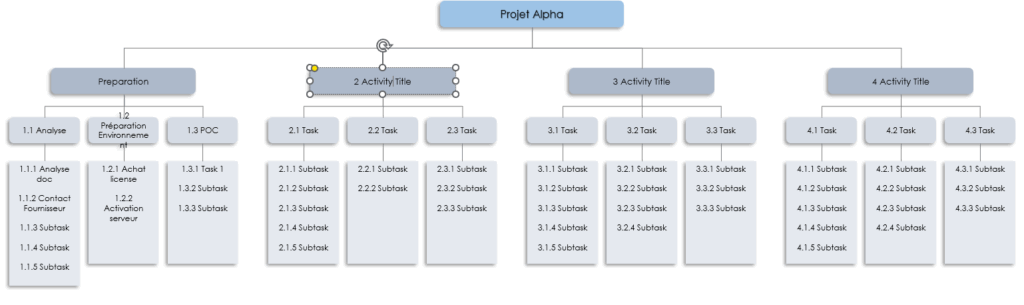 La WBS a été créée avec de simples « formes » dans Excel (voir figure ci-dessous). Cet outil nous permet de décomposer le projet en phases, modules et tâches simples / activités. Cette approche structurée et visuelle réduit notamment les risques d’oubli et offre une vue d’ensemble claire du projet pour toutes les parties prenantes.