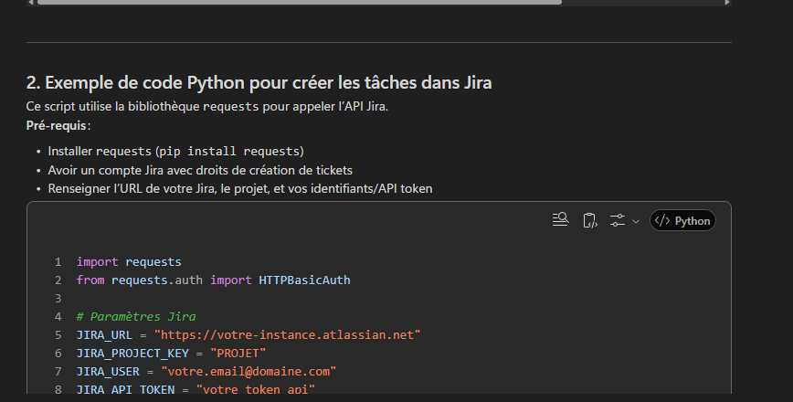 A partir de ce tableau, générer un code permettant de créer les tickets correspondant dans Jira (code non testé)