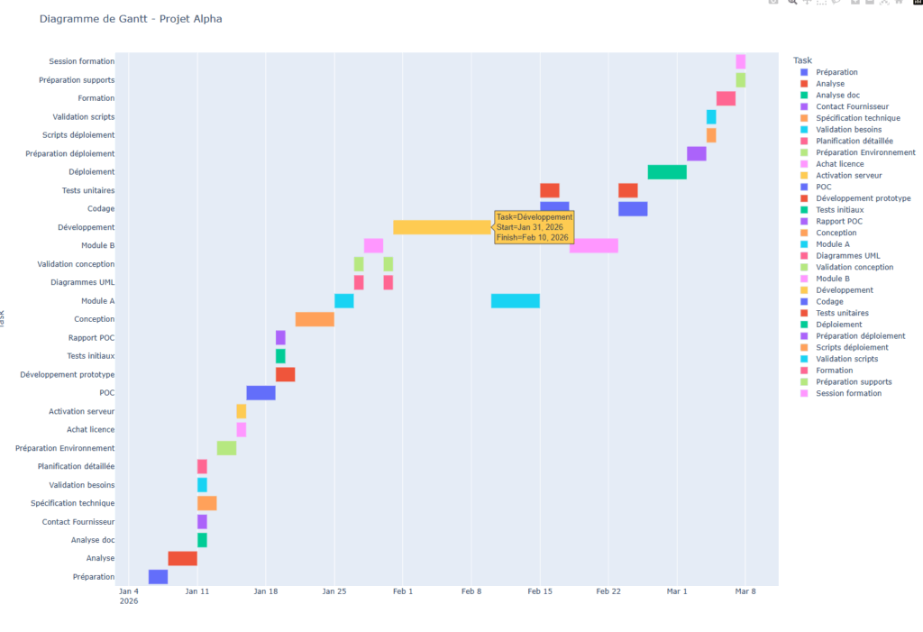 - Créer et ajuster un diagramme de Gantt interactif à partir des données du tableau, pour une date des début donnée. Il s’agit d’un document html dans mon cas, n’ayant pas réussi à générer un contenu Excel satisfaisant.