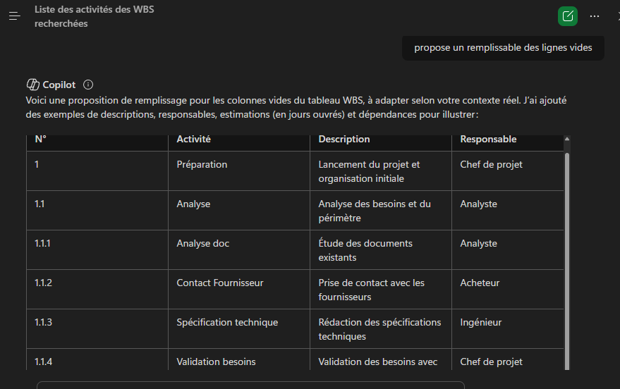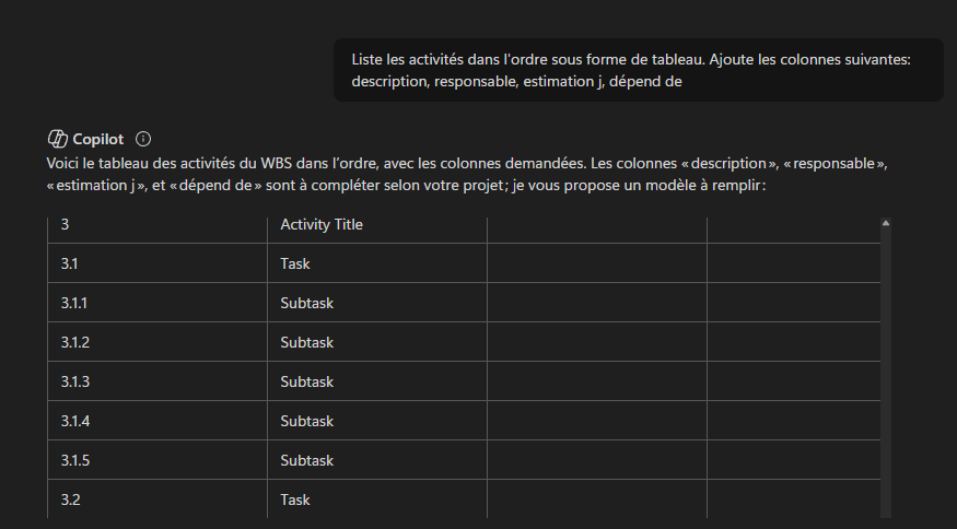 L’avantage de cette approche est qu’il est possible d’ajuster les activités depuis la WBS directement, Copilot se chargeant, à la demande, de mettre à jour la liste des activités (ou le delta).